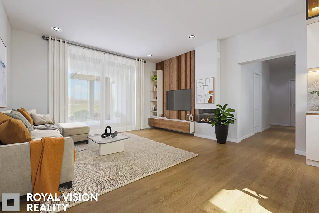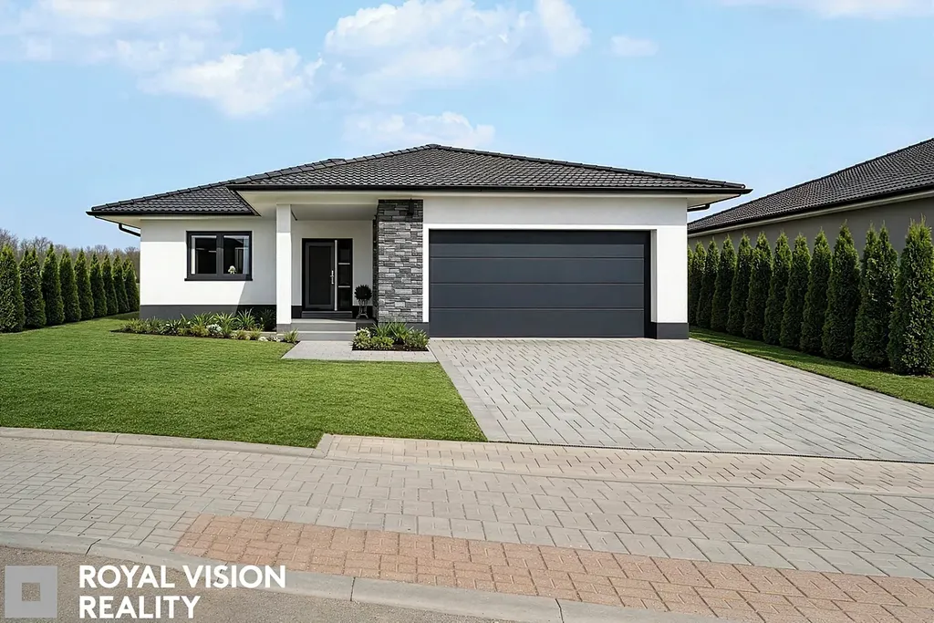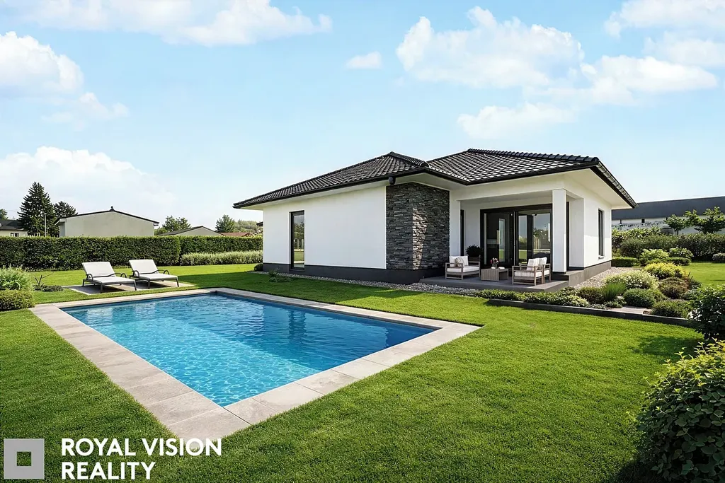 Jedná se o moderní jednopodlažní dům s nadčasovou architekturou a sedlovou střechou v elegantním antracitovém odstínu. Dispozice je promyšlená do posledního detailu tak, aby přirozeně propojovala společenskou část domu s dostatkem soukromí pro každého člena rodiny. Výsledkem je komfortní a funkční bydlení, které odpovídá současným nárokům na kvalitu, prostor i estetiku. Dominantou domu je velkorysý obývací prostor propojený s kuchyňským koutem a vstupem na krytou terasu, která nabízí ideální místo pro rodinná setkání i relaxaci.