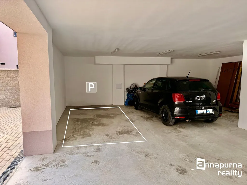 K bytu náleží sklepní kóje a kryté parkovací stání v areálu residence, což zajišťuje komfortní a bezproblémové parkování.
