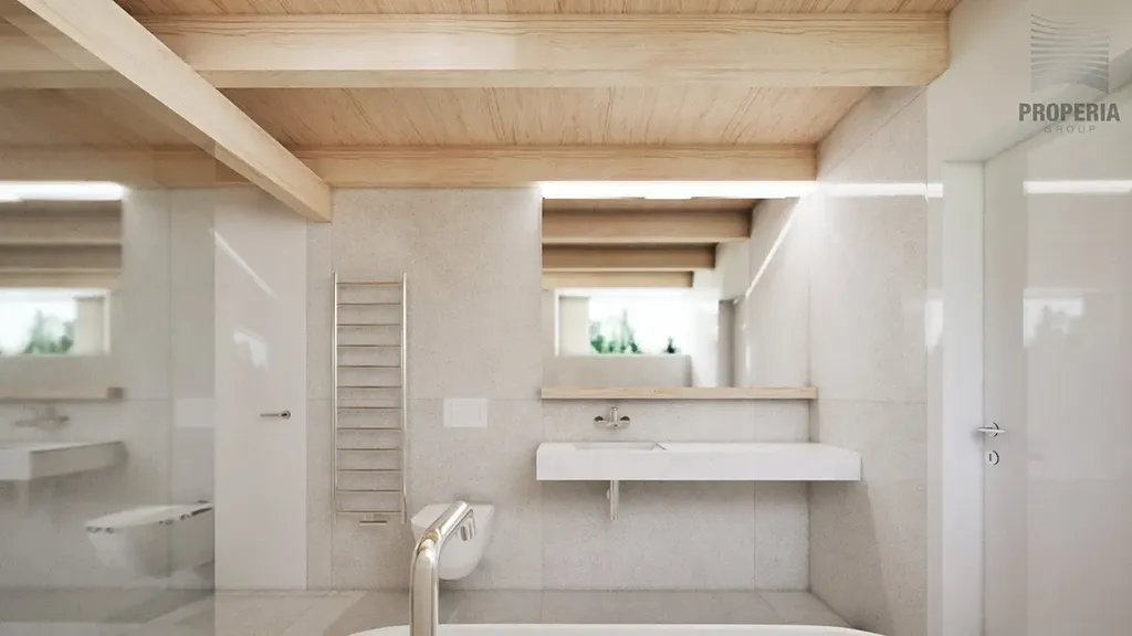 Západně orientovaná terasa je propojena s hlavním obytným prostorem velkým HS portálem, díky němuž se interiér přirozeně otevírá do exteriéru. Obytná část plynule propojuje kuchyni, jídelnu i obývací prostor a působí vzdušně a otevřeně. Vstupní hala je přístupná jak po schodišti, tak výtahem, a nabízí samostatnou toaletu. Praktickým doplňkem je technická místnost s prádelnou, která navazuje na kuchyňskou část.