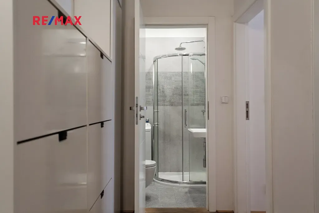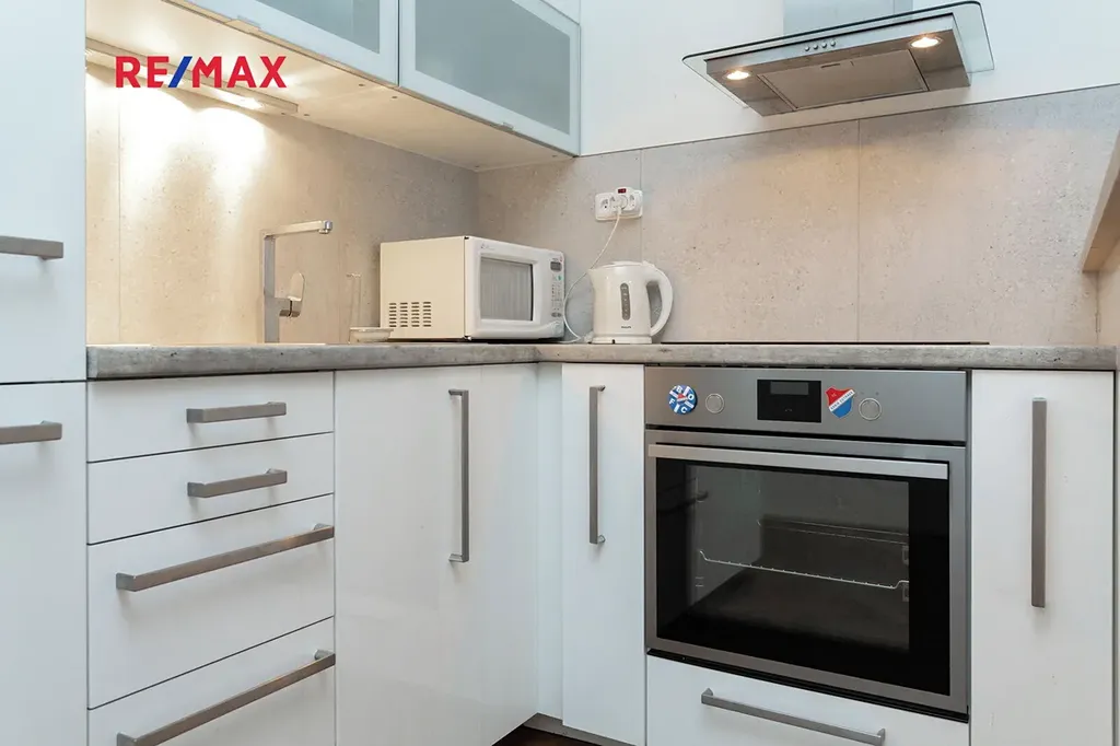 Kuchyně s moderní kuchyňskou linkou, lednicí a barovým sezením. Obývací část a ložnice s okny do klidného vnitrobloku. Koupelna se sprchovým koutem a toaletou, prostorná předsíň. Dřevěné parkety, dlažba. Sklep. Pračka, sušička.