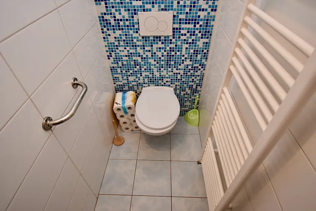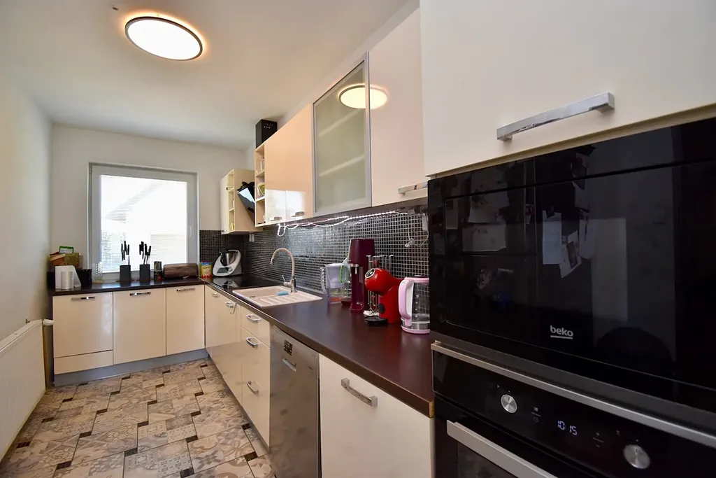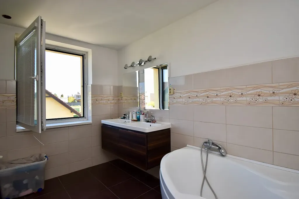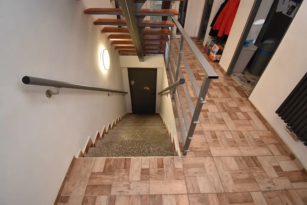 Suterén (čistá podlahová plocha 80 m2) – vstup je v úrovni zahrady, tudíž se jedná o polosuterén díky mírně svažitému pozemku. Nachází se zde celkem 5 místností. Kuchyň, bezbariérová koupelna se sprchovým koutem, kam mohou děti běžet rovnou z bazénu se osprchovat, kotelna, wc, prádelna a další místnosti jako úložný prostor. Je mnoho dalších možností jak využít tyto prostory, rozhodně by bylo možné zde udělat jakoukoliv ordinaci, menší veterinární kliniku, krejčovství, nehtové studio a mnoho dalších možností pro podnikání.