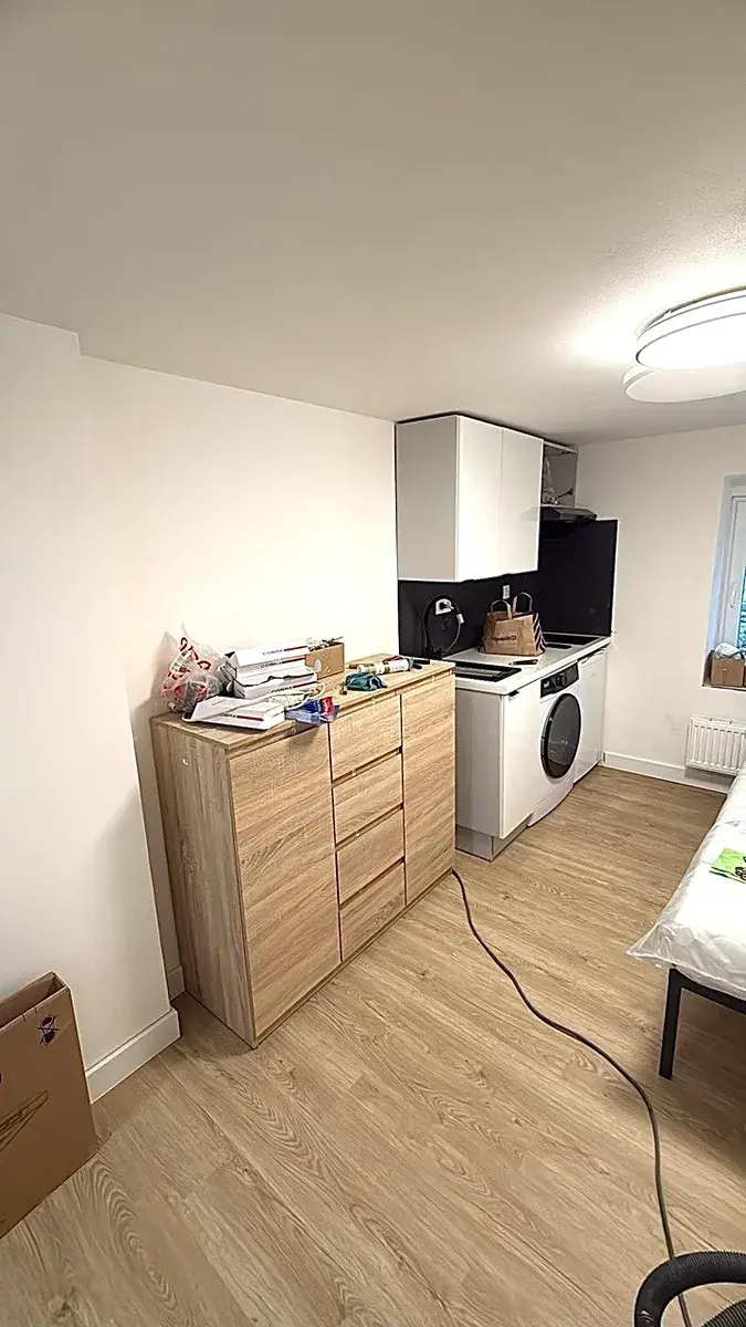 Byt je zařízený. Kuchyň je vybavená kuchyňskou linkou a elektrospotřebiči.