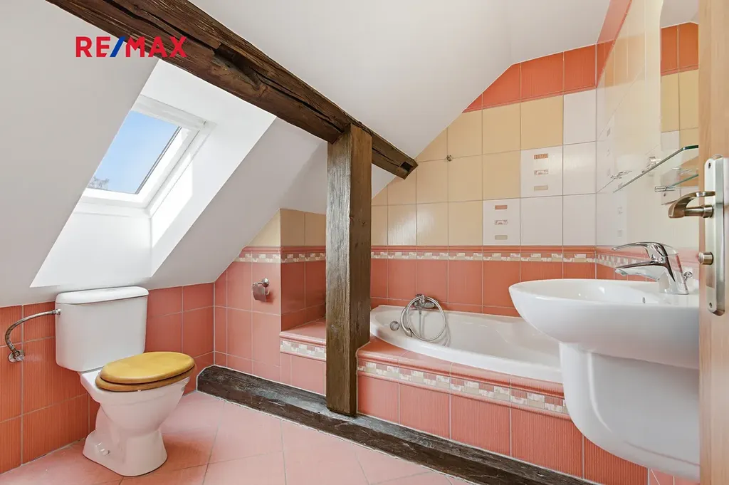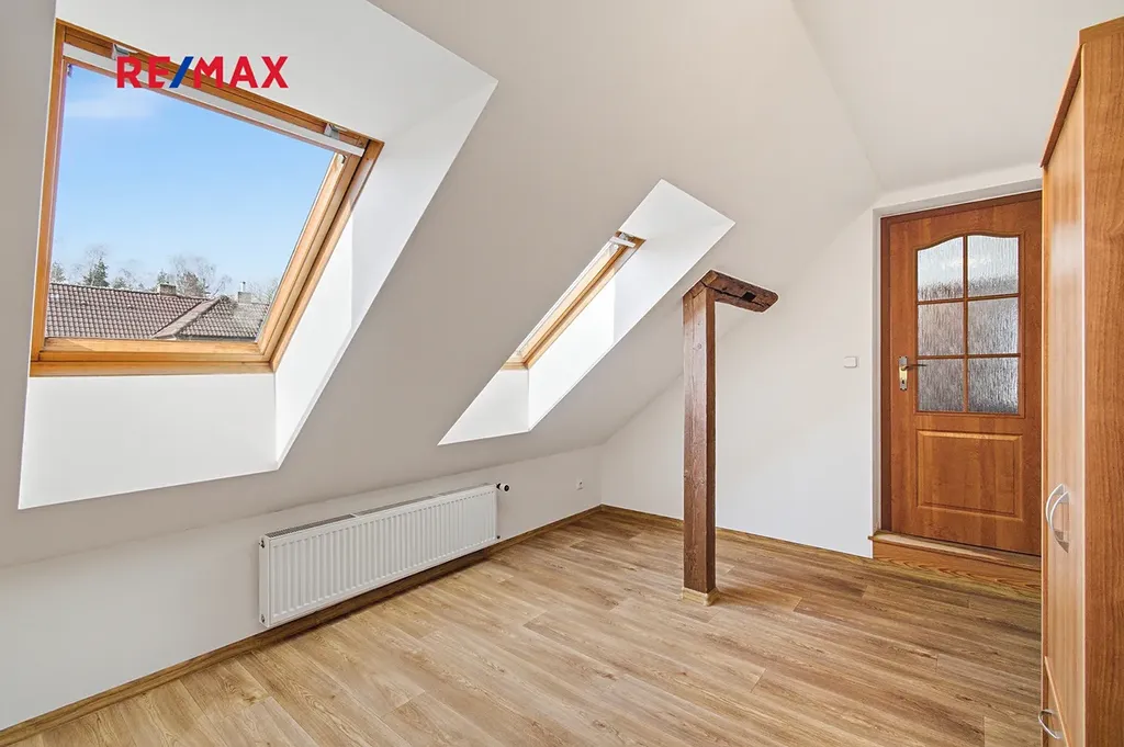 V patře jsou tři neprůchozí světlé a prostorné pokoje, druhá koupelna vybavená vanou a WC. Dům je částečně podsklepen.