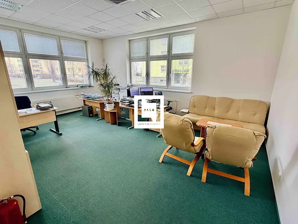 Kancelář je vhodná pro 2 - 6 osob a je vybavená pro 3 místa pracovními stoly, židlemi, PC, skříní, sedací soupravou, věšákem a žaluziemi.