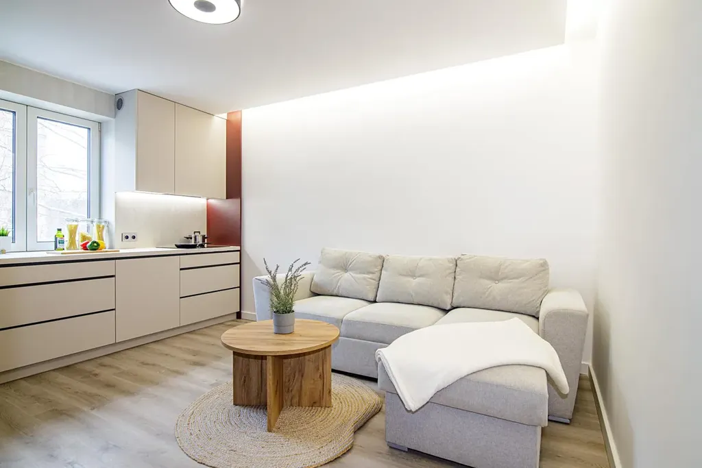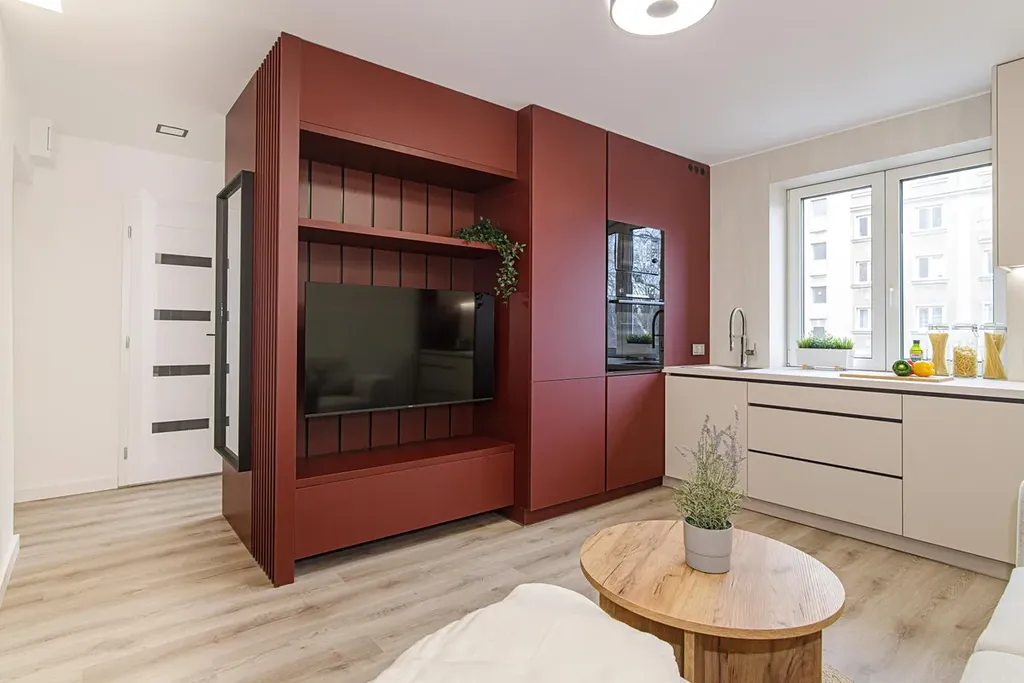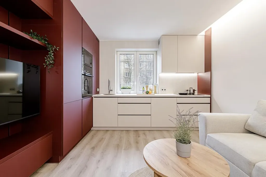 - Plnohodnotnou kuchyňskou linka s vestavěnými spotřebiči, která plynule přechází do obývací stěny s TV
