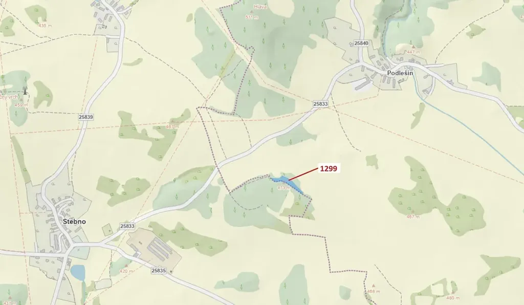 Lesní pozemek o výměře 2275 m2, parcelní číslo 1299, podíl 1/1, katastrální území Podlešín u Stebna, obec Stebno, obec s rozšířenou působností Ústí nad Labem, okres Ústí nad Labem, Ústecký kraj.