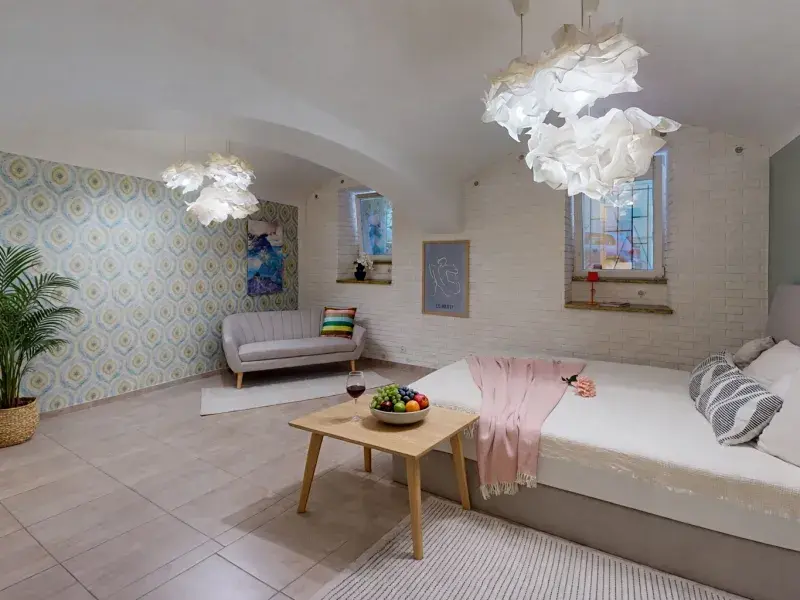 Jednotce dominuje velkorysý prostor (28 m2) s klenutými stropy, který může být jak otevřeným pracovním hubem, tak nabízí možnost přepažení a vytvoření tím dvou samostatných pracoven. Jihozápadní orientaci má kuchyň s jídelnou (kuchyňská linka s ostrůvkem včetně vestavěných spotřebičů) a skýtá výhled do zahrady. Součástí nabízené jednotky je koupelna, samostatné WC, úložná/skladová místnost a úklidová komora.