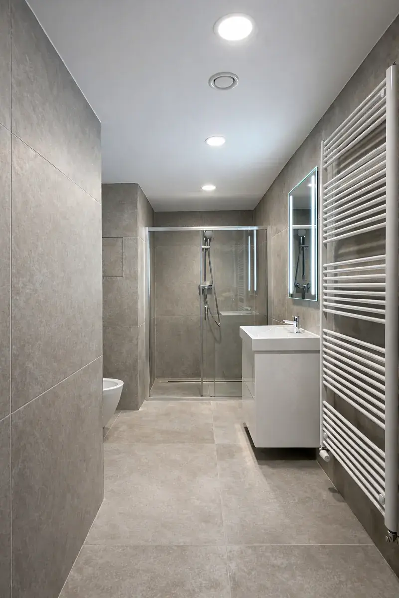 Krásná koupelna s velkým walk-in sprchovým koutem, prostorná předsíň a plně vybavená kuchyňská linka už jenom dotvářejí ten správný pocit skutečného domova.
