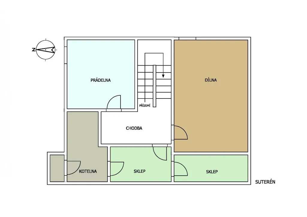 Suterén: sklepní prostory jsou prostorné, umístěné pod celým půdorysem domu a zahrnují velkou dílnu, 2 sklepy, kotelnu a prádelnu.