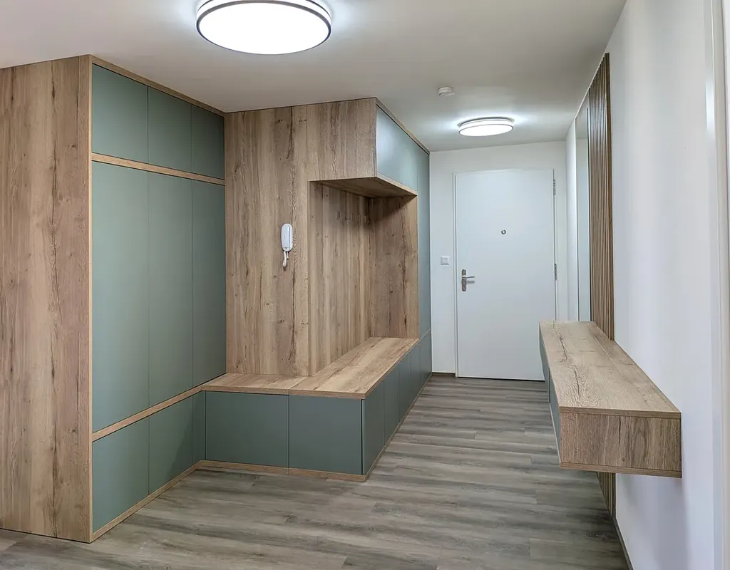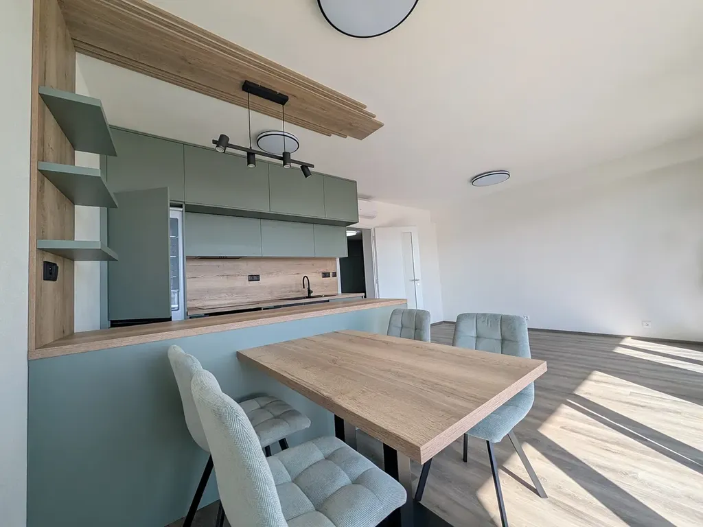 V novostavbě bytového domu Rybářka nabízíme k pronájmu byt 3+kk s podlahovou plochou 76 m2+ balkony 11m2 a 2m2, se zděnou sklepní kójí 3m2 a možností pronájmu dvou garážových stání v 1.PP domu. Částečně zařízený byt s orientací JV (obývací pokoj a velký balkon) a SZ (ložnice, pokoj) je umístěn v 7.NP/7 nyní dokončené novostavby. Jedná se tedy o první pronájem. Z prostorné předsíně vybavené šatními skříněmi s dostatkem úložného prostoru jsou přístupné ostatní místnosti bytu. Obývací pokoj s kuchyňským koutem je zařízený kuchyňskou linkou se spotřebiči (lednice s mrazákem, varná deska, el. trouba, myčka, digestoř), barovým ostrůvkem s osvětlovací rampou, jídelním stolem se židlemi. Veškerý nábytek v bytě byl vyhotoven stolařskou firmou na zakázku. Z pokoje je přístupná prostorná terasa. Koupelna je vybavena vanou, umyvadlem, otopným žebříkem, přípojkou pro pračku. Vytápění bytu je zajištěno podlahovým topení, v každém pokoji je umístěna klimatizační jednotka. Okna jsou osazena elektrickými venkovními žaluziemi.