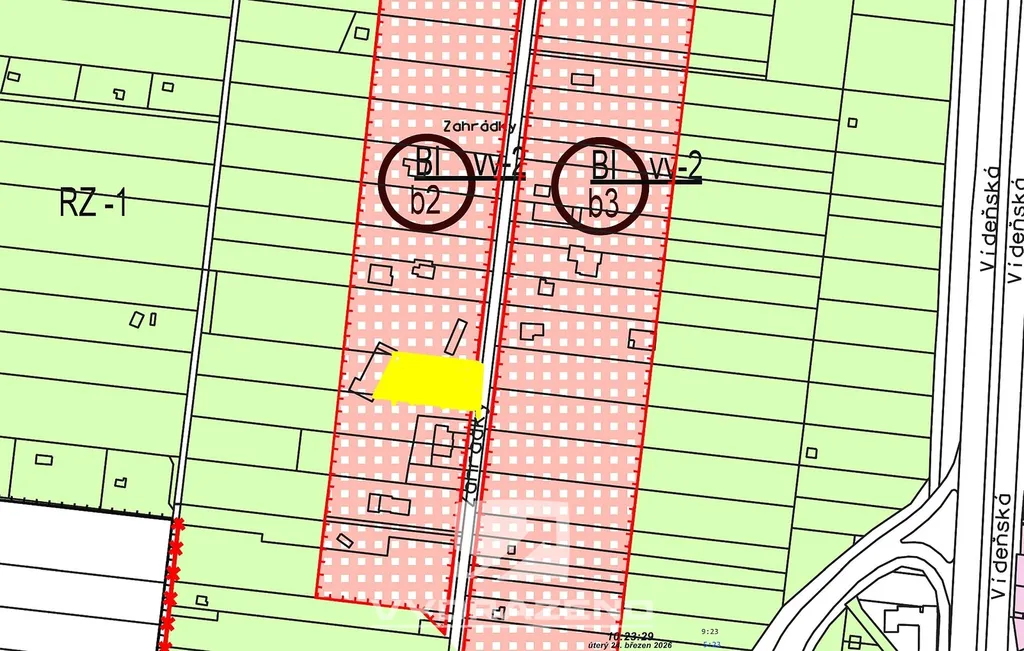 V územním plánu je pozemek označen jako BI – plochy bydlení v rodinných domech – návrh změn. Viz územní plán a jeho textová část přiložené v dokumentech aukce.