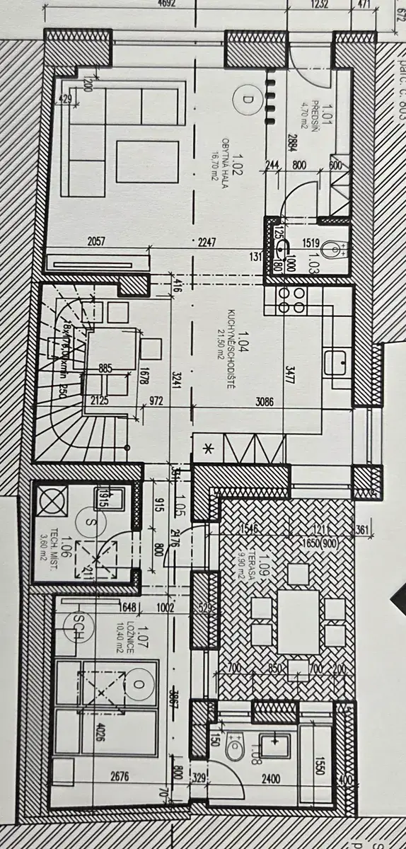 Do zadní části domu se přesuneme spojovací chodbičkou, ze které je i vstup do technické místnosti a východ na terasu se dvorem. V zadní části je samostatná ložnice s vlastní koupelnou, toaletou a úložným prostorem. Na ložnici Vás zaujme vysoký strop se střešním oknem, díky kterému působí vzdušně a prostorně.