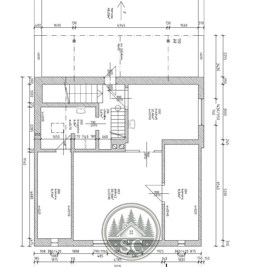 V patře pak najdete další dva pokoje, přičemž z jedné z místností je vstup do prostorné komory. Z chodby se vstupuje na terasu, ze které je krásný výhled na okolní krajinu. Zároveň je z chodby přístup do prostoru s přípravou na druhou koupelnu, kde jsou již připraveny rozvody vody, odpadu a elektřiny. Z chodby je také vstup na půdu. Horní patro tak nabízí zajímavý potenciál pro vybudování samostatného bydlení o dispozici 1+1.