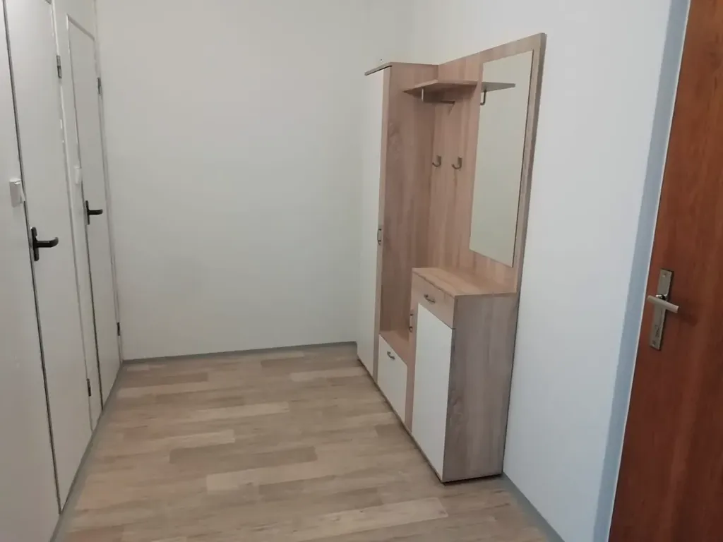 V bytě se nachází velká předsíň s věšákovou stěnou a botníkem, opravená koupelna s vanou a umyvadlem (umakart, místo pro pračku), samostatné WC, nová kuchyňská linka se spíží a jídelním koutem (plyn.sporák, dřez, digestoř) a prostorný pokoj.