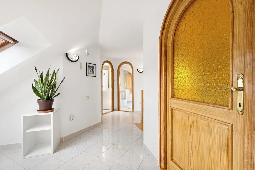 Podkroví dále nabízí dva samostatné pokoje, halu, koupelnu, šatnu a technickou místnost.