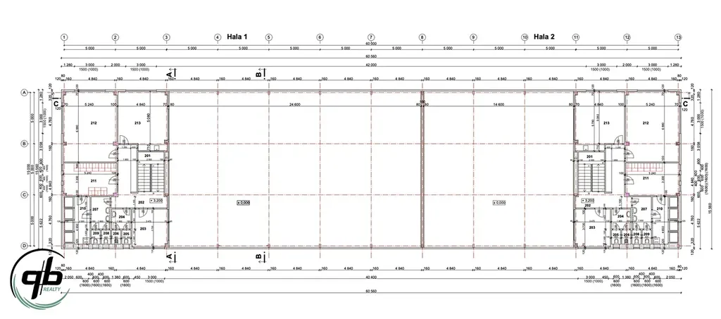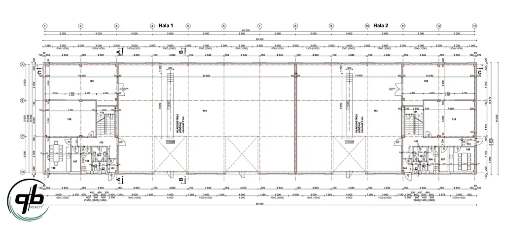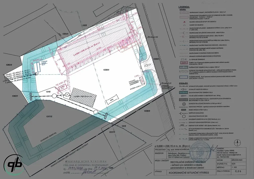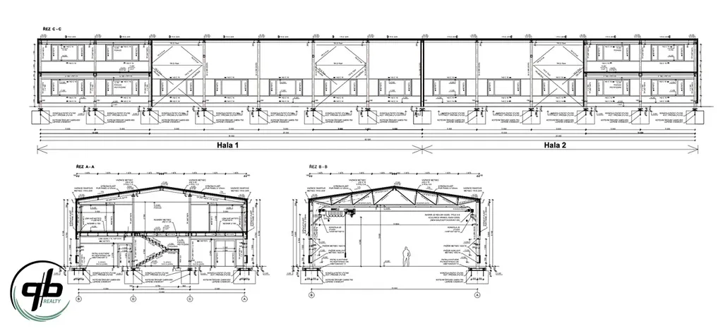 Nabízíme k prodeji pozemek v průmyslové zóně o výměře 7.384 m2 ve Vratimově, na ul. Mourova. Na pozemku je vydáno pravomocné stavební povolení k výstavbě haly o zastavěné ploše 942,31 m2. Hala je rozdělená na dva samostatné bloky, každý s dvoupodlažní administrativní a otevřenou jednopodlažní skladovou částí s jeřábovou kočkou. Je navržená jako montovaná stavba, o celkových rozměrech 60,56 m x 15,56 m, výšky 7,4 m. Je tvořená ocelovým skeletem opláštěným stěnovými PUR panely tl. 120 mm. Nosná střešní konstrukce je navržena ocelová příhradová, sedlová se sklonem 15%. Střešní plášť je navržen z PUR panelů tl. 120 mm.
