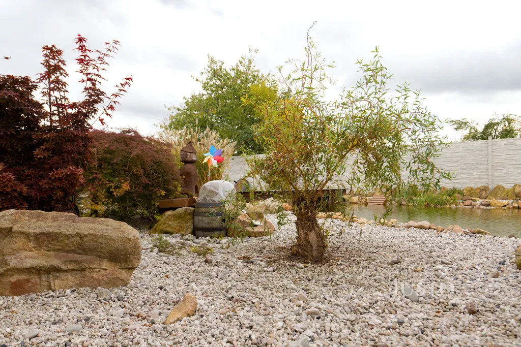 K domu náleží rozsáhlý vlastní pozemek o celkové rozloze 1819 m², z toho zahrada činí 1400 m². K dispozici je prostorná terasa, která je přímo propojena s obývacím prostorem velkými francouzskými okny, což podtrhuje propojení interiéru s exteriérem. Na pozemku je připraveno parkování až pro 4 vozy, celý prostor je oplocen a situován v klidné části obce.