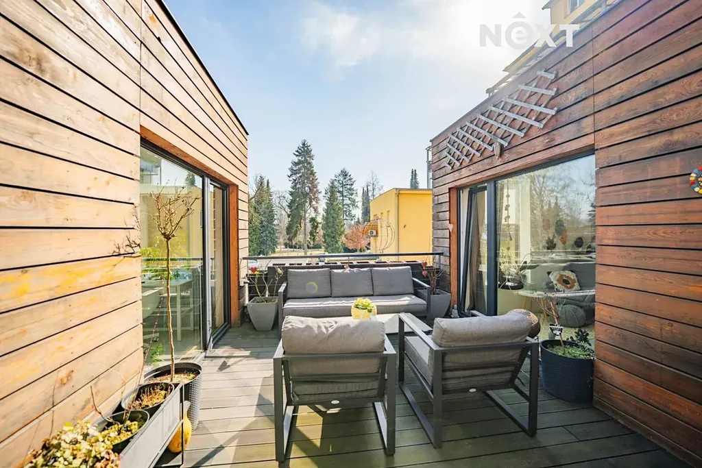Velkou přidanou hodnotou bytu jsou dvě prostorné terasy, které dodávají bydlení jedinečný charakter. U vstupu do bytu se nachází terasa o velikosti 42 m², která vytváří příjemný a reprezentativní vstup do domova a umocňuje pocit bydlení v rodinném domě. Druhá terasa o velikosti 15,5 m² je přístupná ze tří místností a nabízí dostatek soukromí – ideální místo pro ranní kávu, večerní sklenku vína nebo klidný odpočinek.