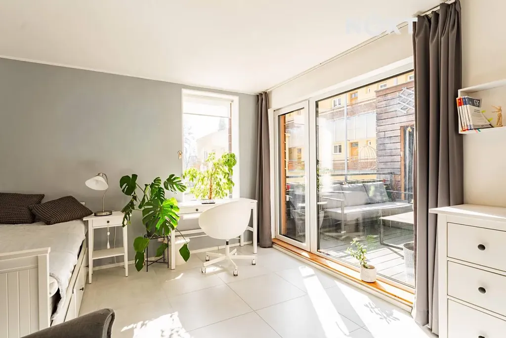 Velká francouzská okna zajišťují dostatek denního světla a zároveň umožňují přímý vstup na terasu z více místností, díky čemuž je byt krásně propojen s venkovním prostorem.