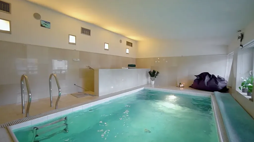 privátní bazén (cca 36 m²) s protiproudem a moderní bezchlorovou úpravou vody