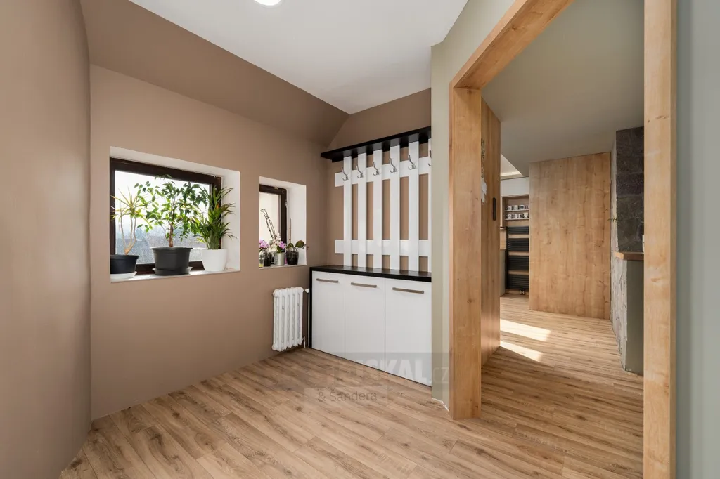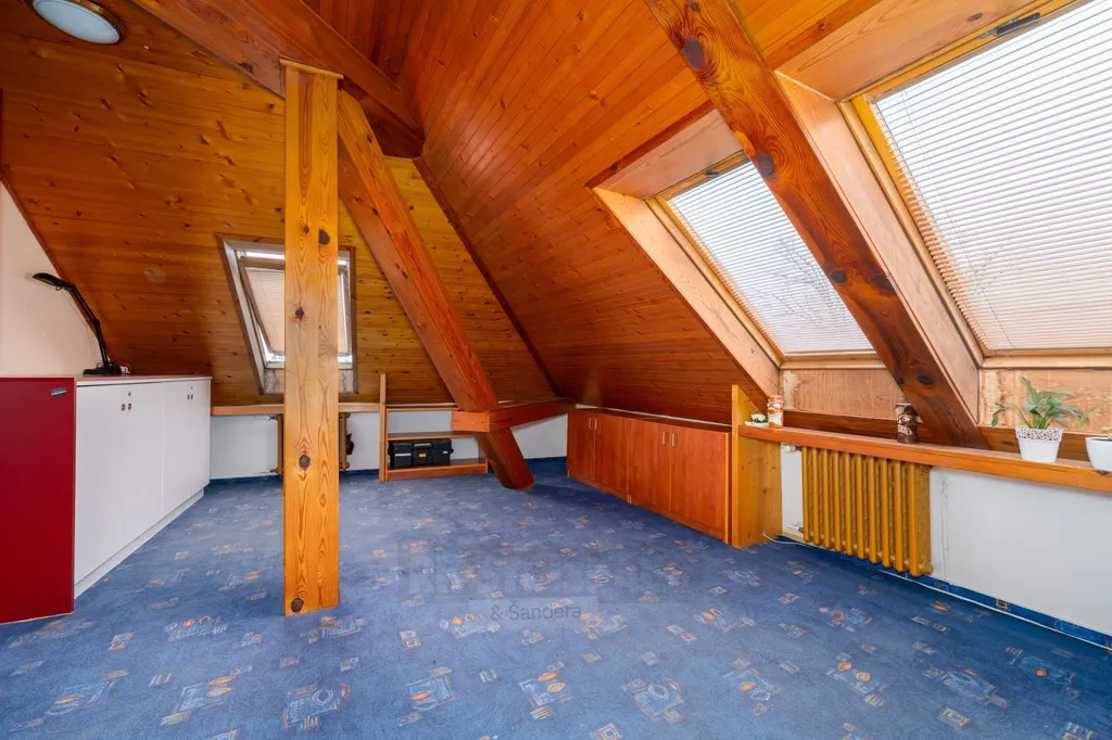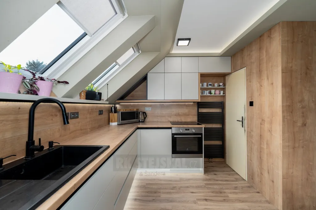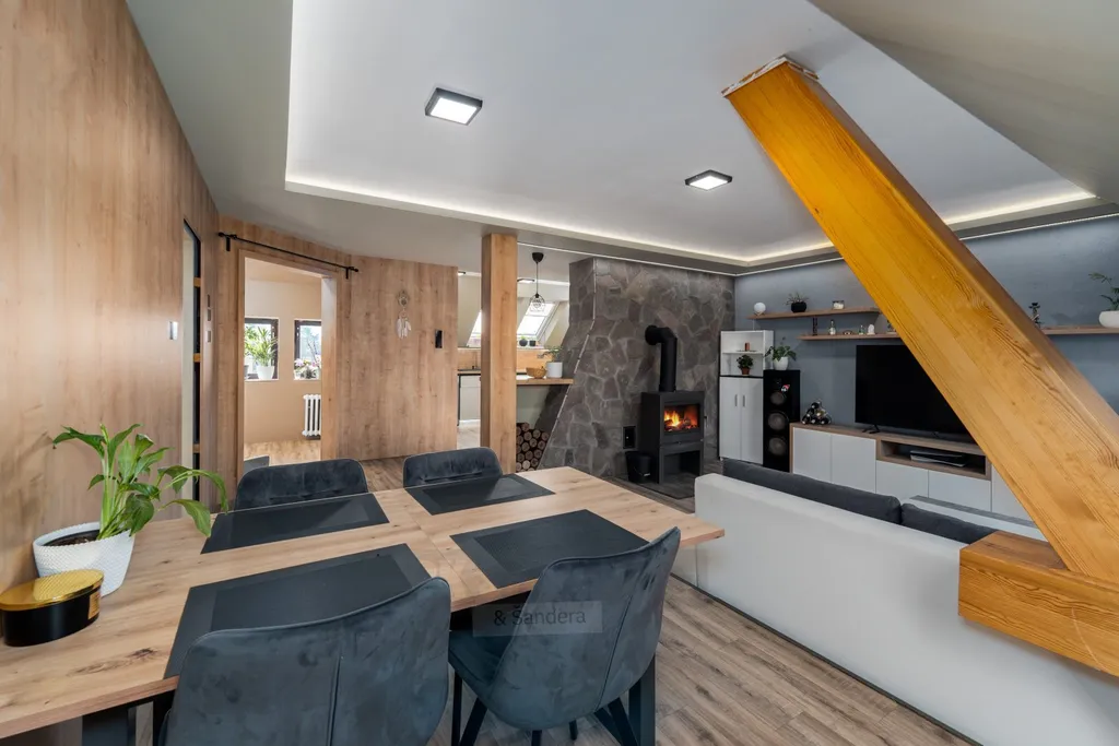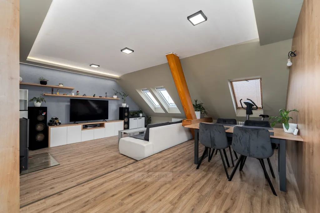 Interiér bytu vás okouzlí svou atmosférou – přiznané půdní trámy, krb a střešní okna vytvářejí útulný a zároveň vzdušný prostor. Byt prošel velmi zdařilou rekonstrukcí a modernizací, disponuje odhlučněnými podlahami a praktickým dispozičním řešením, které zajistí komfort i větší rodině.