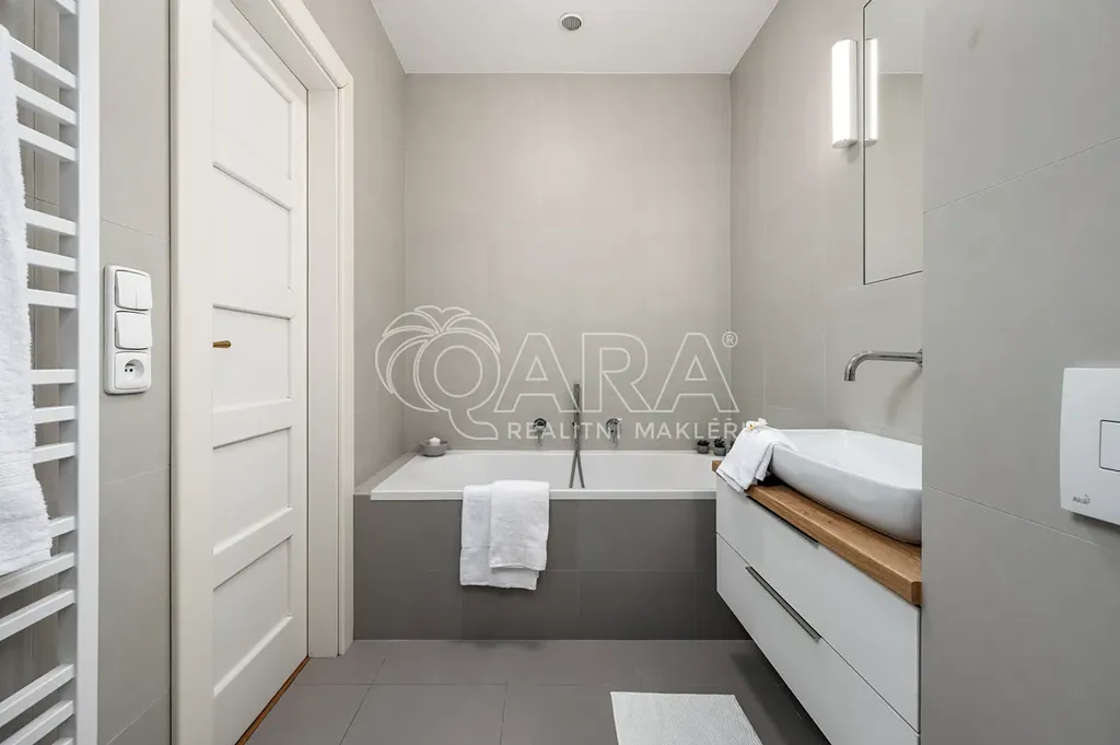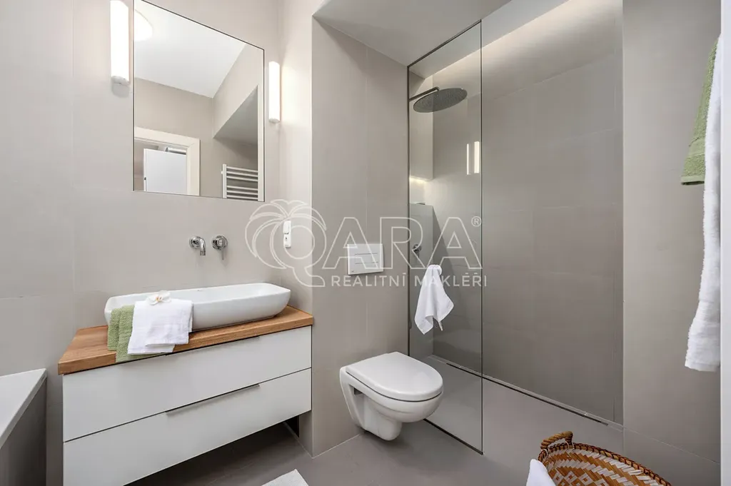 Tento byt prošel přibližně před deseti lety rekonstrukcí, díky níž byla vytvořena moderní a otevřená dispozice, které dominuje obývací pokoj s kuchyňským koutem. Zde se také nachází balkon šikovně orientovaný do klidného vnitrobloku. V zadní části bytu jsou pak dvě samostatné prostorné neprůchozí ložnice a koupelna s vanou, širokým walk-in sprchovým koutem a toaletou.