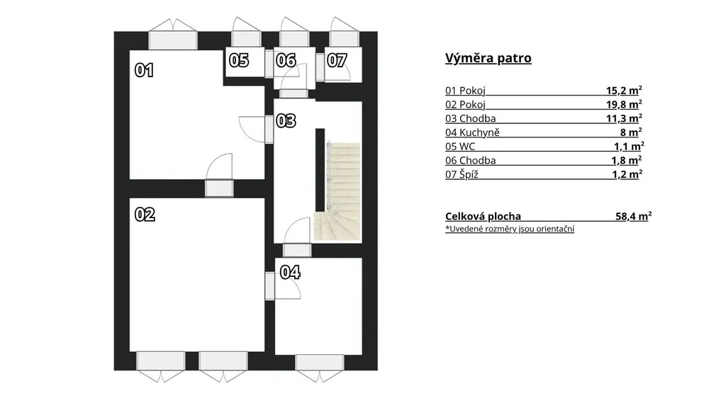 Celková užitná plocha činí 116 m² rozdělených do dvou podlaží. V přízemí najdete vstupní chodbu se schodištěm, dva pokoje, koupelnu, samostatné WC a spíž. Patro přináší další dva pokoje, kuchyni, WC a úložný prostor.