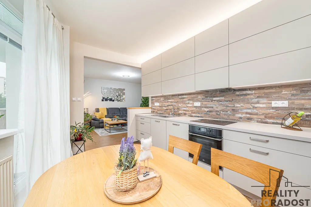 Byt je velmi hezky řešený, obývací pokoj tvoří středovou část bytu se vstupem do kuchyně, na balkon a do dalších dvou pokojů. Byt je moderně zrekonstruovaný se spoustou úložného prostoru ve vestavných skříních, šatně, komoře a spíži. Další úložný prostor nabízí sklep v suterénu. K bytu je možné pronajmout 1- 2 garážové stání.