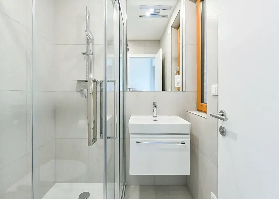 Dále zde naleznete elegantní koupelnu se sprchovým koutem, technické zázemí s prádelnou a vstupní halu s prakticky a vkusně řešenými vestavěnými úložnými prostory.
