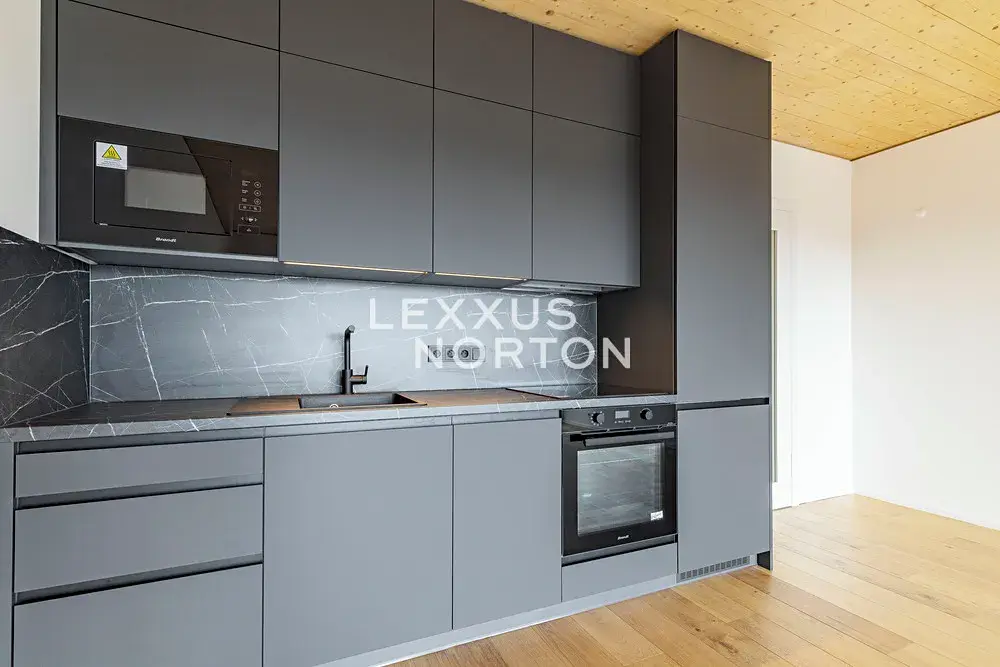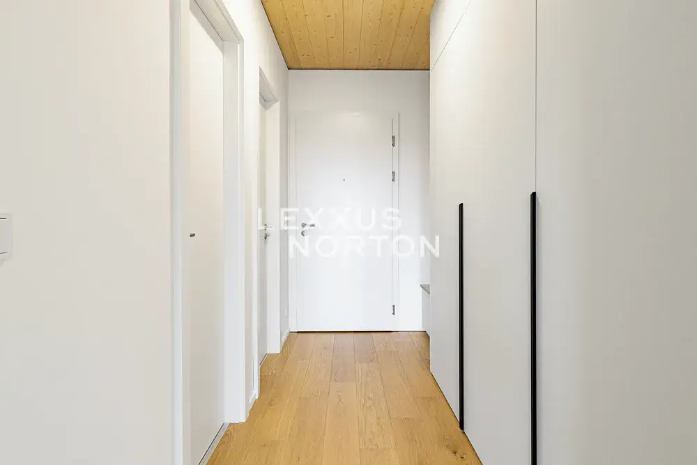 Kuchyňský kout je vybavený indukční varnou deskou, troubou, lednicí s mrazákem, mikrovlnnou troubou a myčkou nádobí. Vstupní chodba disponuje vestavěnou skříní. Byt dále disponuje moderním smart home systémem Loxone, který umožňuje mimo jiné inteligentní ovládání venkovních žaluzií, regulaci podlahového vytápění a chlazení v každé místnosti či monitorování spotřeby vody a energie.