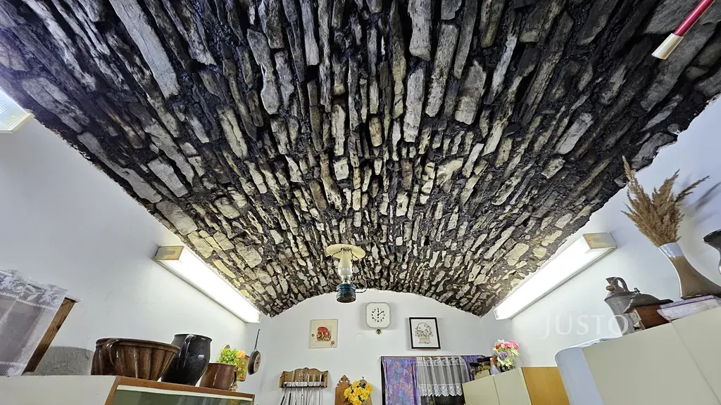 V přízemí domu se nachází hlavní společenská místnost, kde se odehrávaly nejen rodinné oslavy. Dále zde najdete velkou koupelnu (pozn.: historická vlajka zachycená na fotografii je recesí, nikoliv odkazem na minulý režim), skladové prostory a původní kuchyň s unikátním kamenným klenutým stropem – to je prostor, který přímo vybízí k citlivé modernizaci. Ve stodole najdete velké úložné prostory a truhlářskou dílnu.