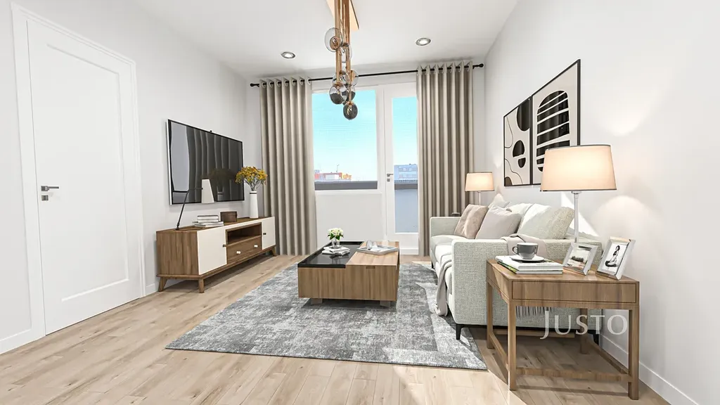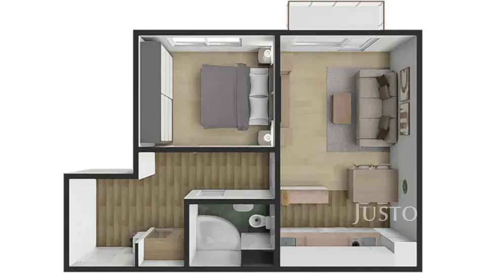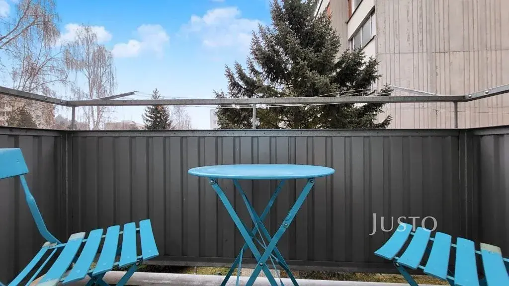 Dispozice bytu: obývací pokoj s kuchyňským koutem a vstupem na balkon, ložnice, vstupní předsíň s úložnými prostory, zděná koupelna s vanou a toaletou.