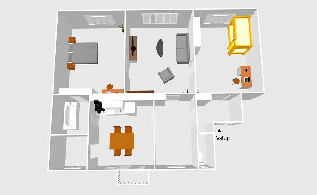 Byt zaujme velkorysým prostorem a praktickou dispozicí. Dominantou jsou prostorné, světlé pokoje s vysokými stropy a dostatkem přirozeného světla, které podtrhují jedinečný charakter bydlení.
