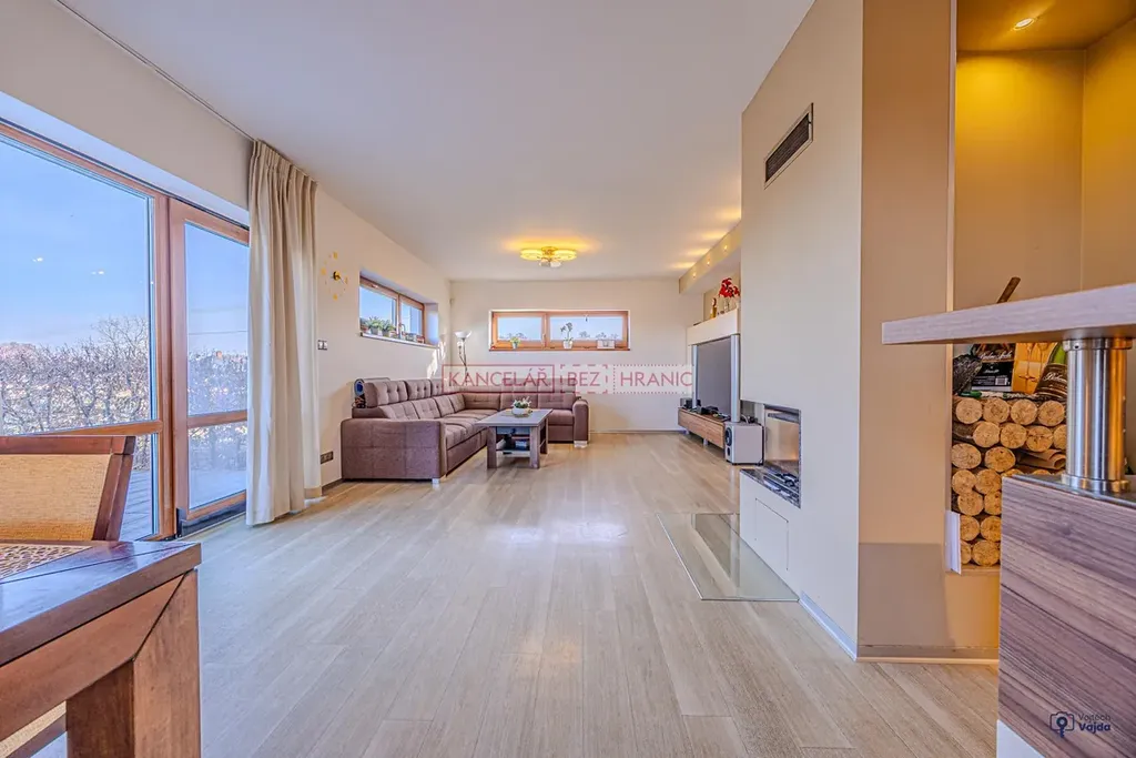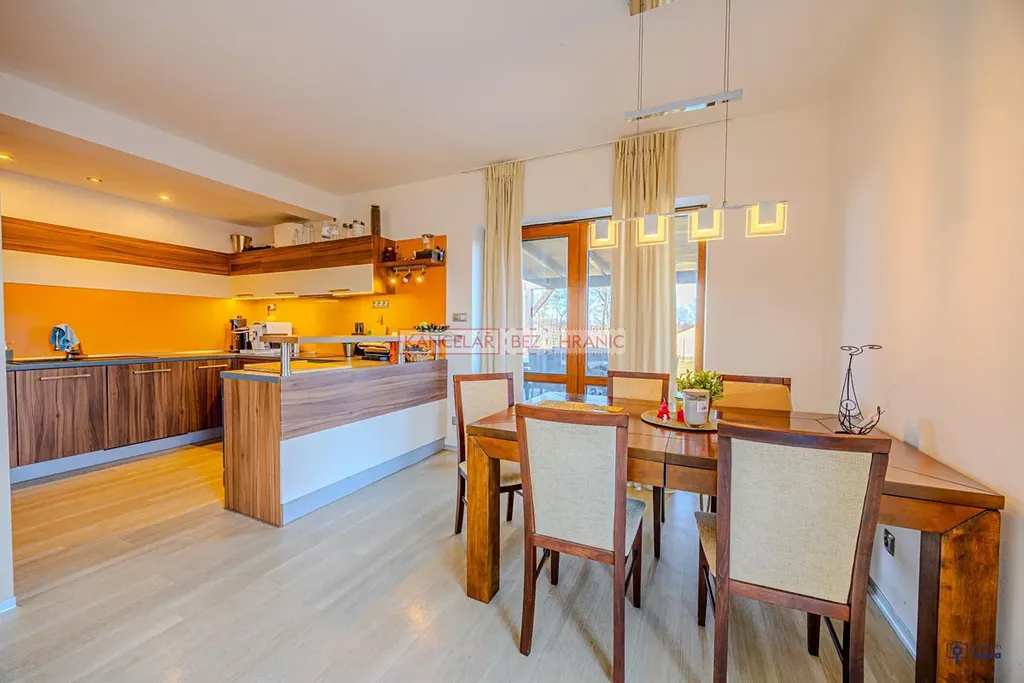 Dominantou domu je světlý obytný prostor s jídelnou, ze které je přímý vstup na terasu a do stylové dřevěné pergoly s posezením, ideální pro relaxaci, rodinné večeře i setkání s přáteli.