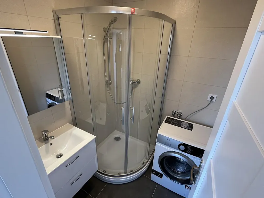 koupelny - je sice malá, ale najdete v ní to, co je třeba - sprchový kout, novou pračku zn. AEG, otopný el. žebřík černé barvy a samozřejmě umyvadlo s podumyvadlovou skříňkou a zrcadlem na stěně.