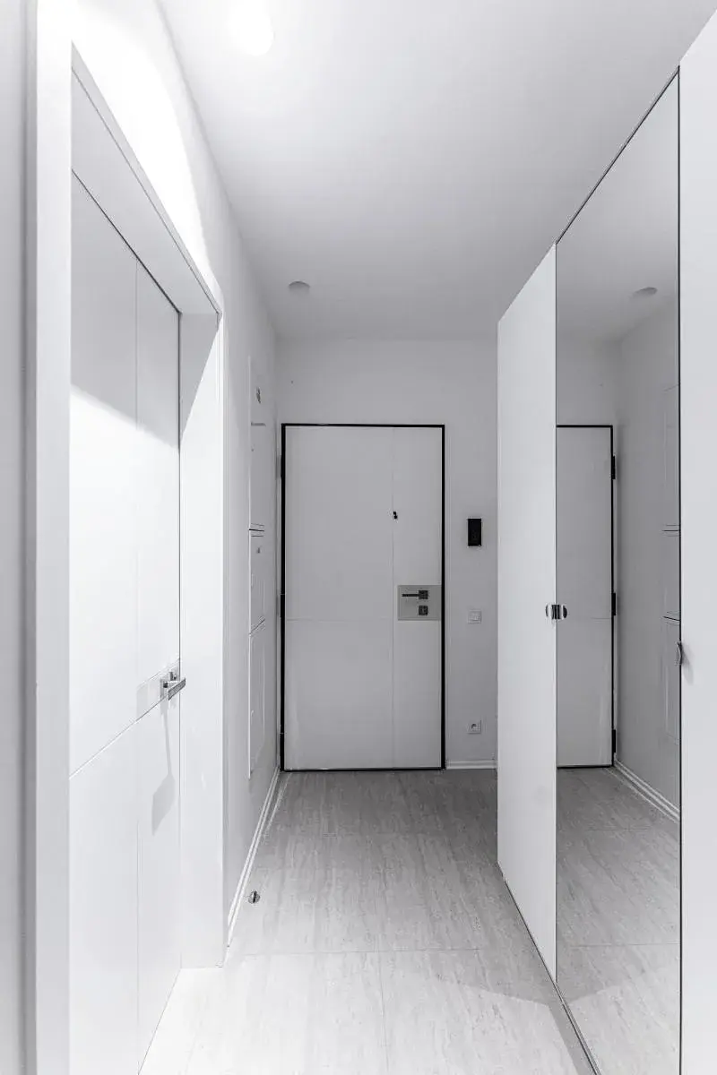 Design bytu i zařízení je ve světlém dekoru, což zvýrazňuje i světlé dřevo na podlahách.