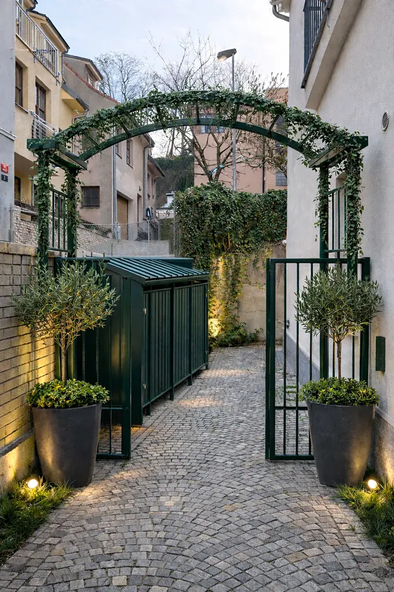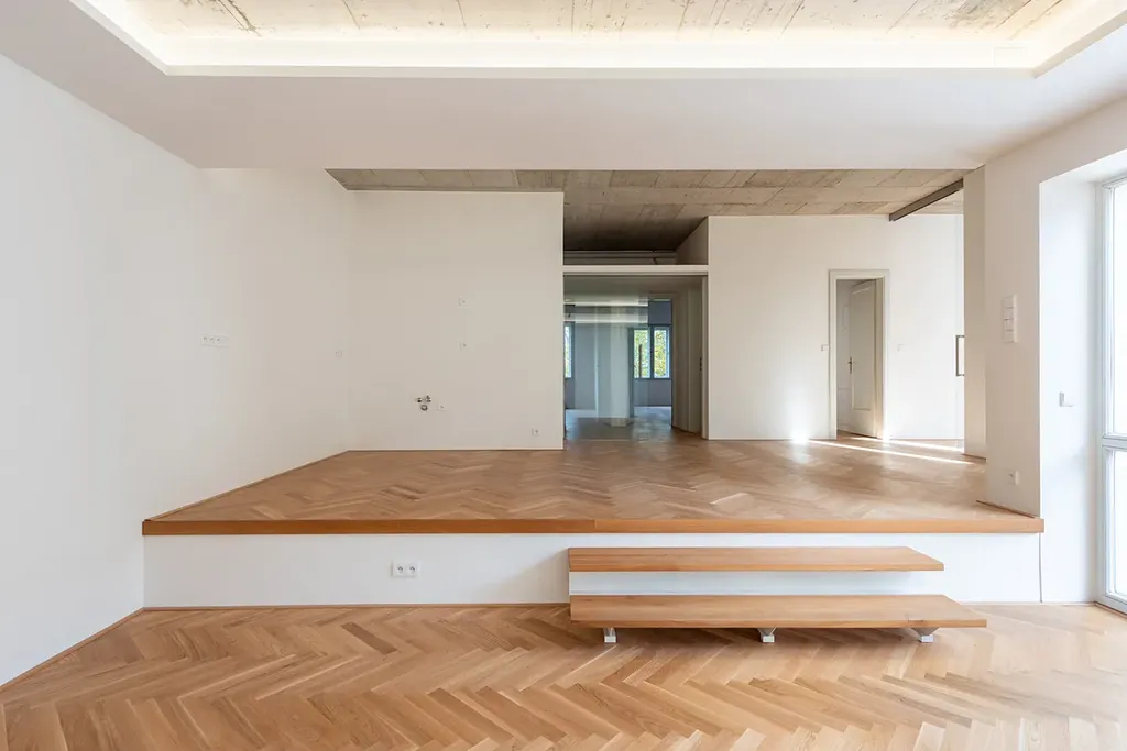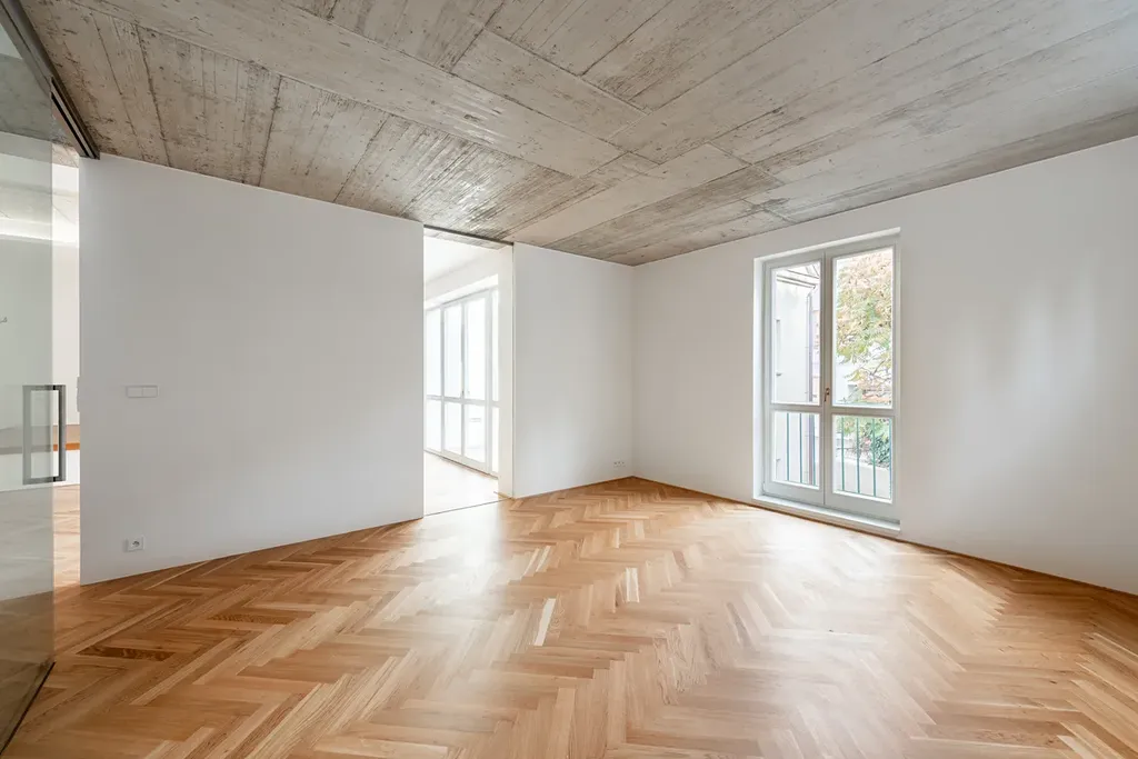 Tento přístup vychází ze spolupráce architekta Jiřího Huška se švýcarským architektem Christianem Kerezem. Beton zde zároveň odkazuje na broušené teracové podlahy i opěrnou stěnu dvora, s nimiž tvoří jednotný, harmonický celek oslavující pravdivost a poctivost konstrukce. Součástí bytu je také samostatná garsoniéra s koupelnou (29 m²), ideální pro hosty, au-pair či domácí kancelář. Je orientována do tichého vnitrobloku a poskytuje naprosté soukromí s výhledem do stromořadí a popínavé zeleně. Je to malý svět sám pro sebe – prostor, který přirozeně doplňuje charakter celého bytu.