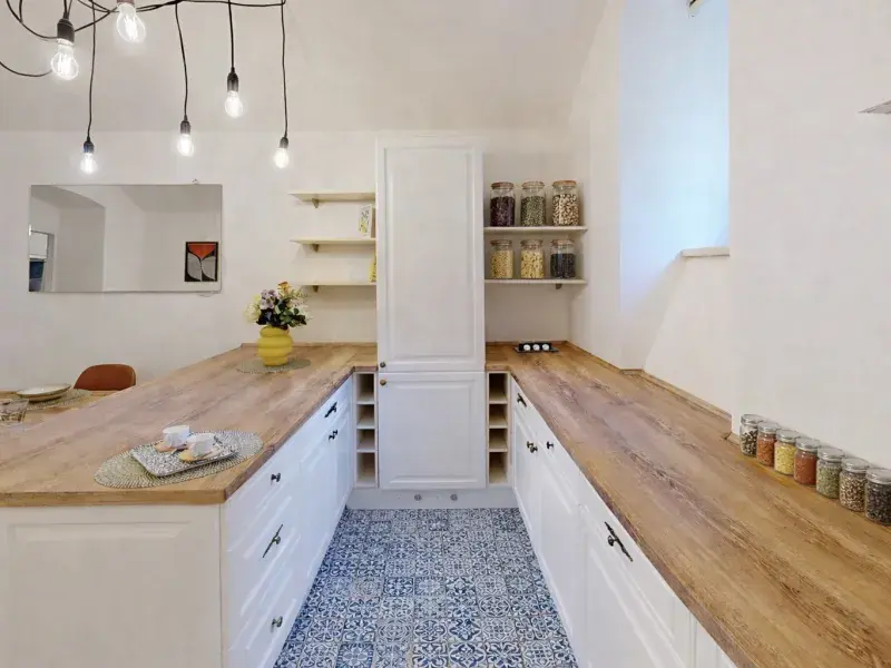 Z chodby vcházíme do velkorysého obývacího prostoru (28 m2) s klenutými stropy, jenž je aktuálně ložnicí s obývací částí, je však možnost jej přepažit a docílit tak dvou samostatných pokojů. Pokračujeme do prostoru s kuchyní a jídelnou (kuchyňská linka s ostrůvkem včetně vestavěných spotřebičů) komunikující se zahradou osvětlenou odpoledním sluncem. Samostatným vstupem z chodby se přesouváme do originálně řešené útulné koupelny, či na samostatné WC. Byt disponuje též praktickou šatnou a úklidovou komorou.