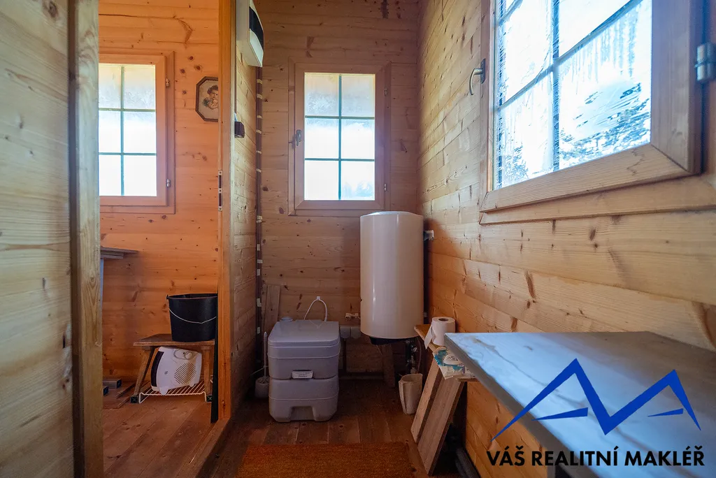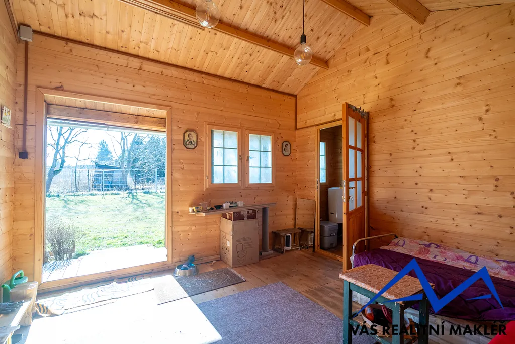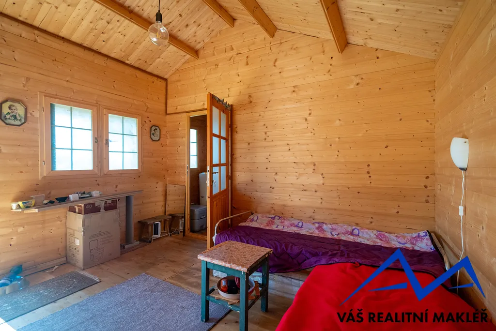 Druhá chata (12 m² ) je využívána jako sklad na nářadí. Je zde také kuchyňka s elektrickým vařičem a místo na lednici.