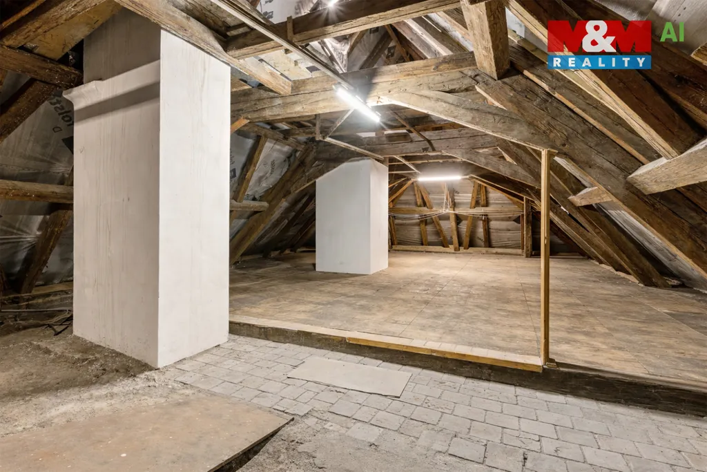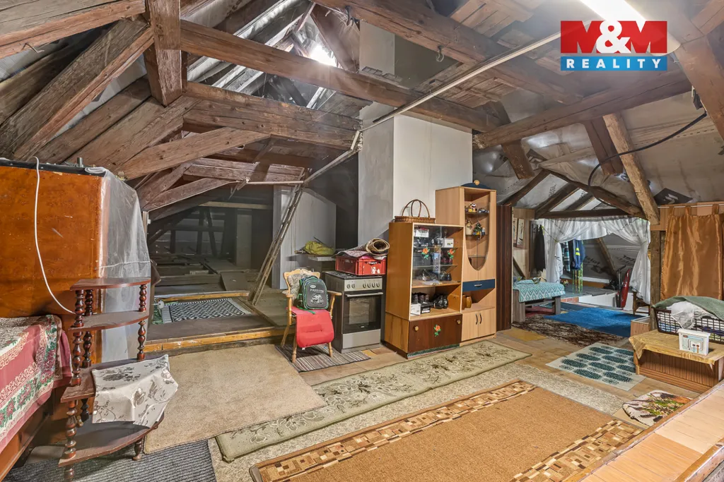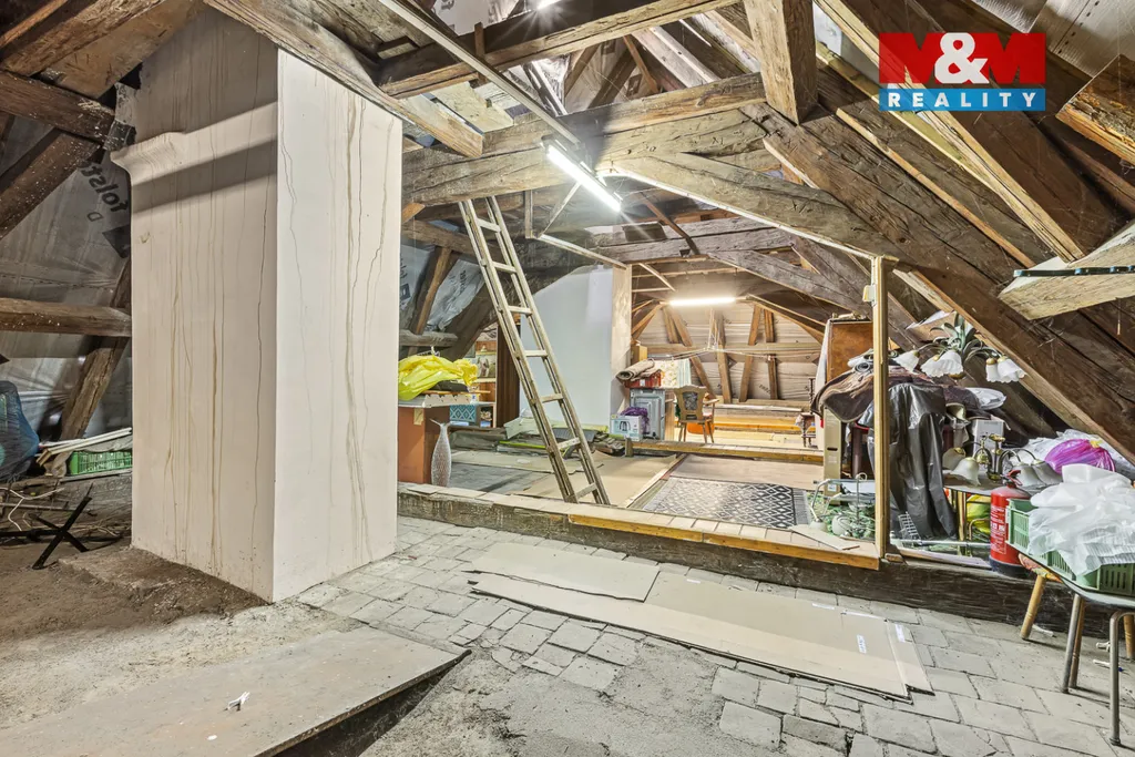 Na půdu vystoupáme po pohodlném schodišti a ta nás pak překvapí také svou velikostí a výškou, kde jsou další možnosti k rekonstrukci.