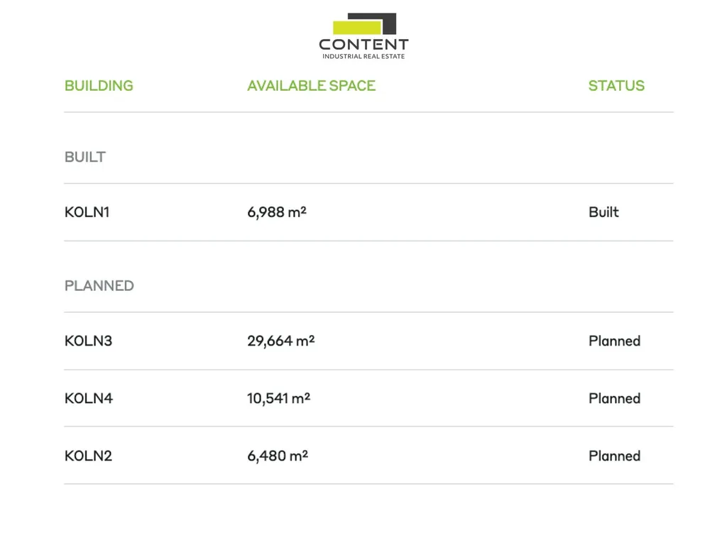 - samostatné industriální prostory až 6988 m² (budova KOLN1)