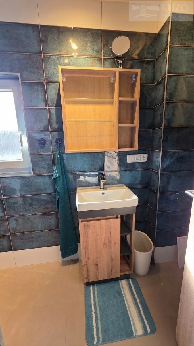 Skutečnou dominantou bytu je luxusní koupelna s oknem, které zajišťuje přirozené denní světlo a perfektní větrání. Je vybavena designovými italskými obklady s efektem metalické oxidace v petrolejovém odstínu, které v kombinaci s dřevěným dekorem nábytku vytvářejí moderní a hřejivou atmosféru.