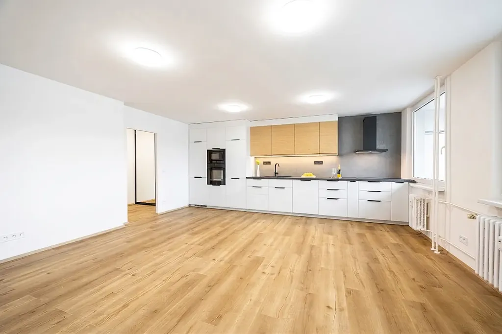 Dominantou bytu je prostorný obývací pokoj s kuchyní na míru o celkové ploše 31 m². Kuchyň je plně vybavena vestavnými spotřebiči (elektrická trouba, mikrovlnná trouba, indukční deska, myčka nádobí) a přirozeně navazuje na obytný prostor. Koupelna je řešena velmi velkoryse – nabízí vanu, samostatný sprchový kout, podlahové vytápění s digitálním termostatem, elegantní topný žebřík i designové umyvadlo se skříňkou.