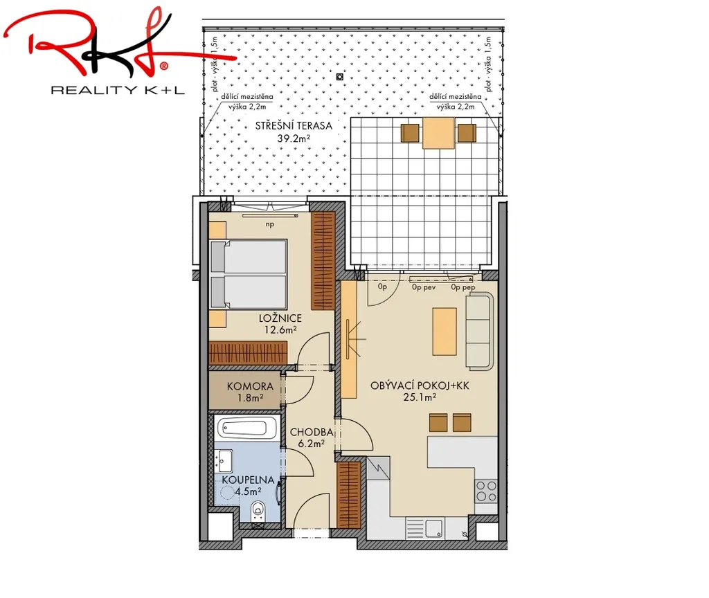 Byt o dispozici 2+kk, který se nachází v 1.patře bytového domu v ulici Stočesova. Výměra bytu činí 52,3 m2 + 39,2 m2 terasa. Vnitřní dispozice: Vstupní chodba kde se nachází vstup do obývacího pokoje spojeného s kuchyňským koutem, nabízí přímí vstup na terasu, kuchyňský kout vybaven moderními spotřebiči. Ložnice. Koupelna s vanovým koutem a toaletou. Komora.