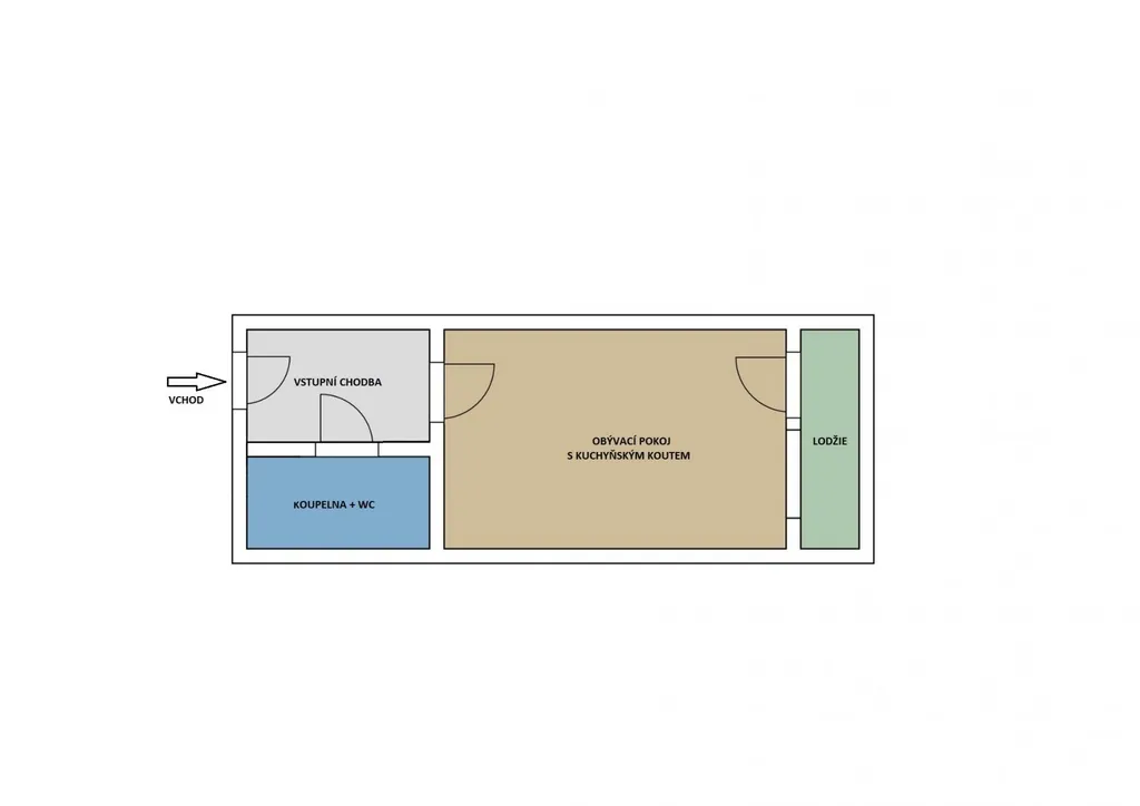 Dispozice bytu: vstupní chodba, obývací pokoj s kuchyňským koutem, koupelna se sprchovým koutem a wc, lodžie. Okna bytu jsou orientována na východ.
