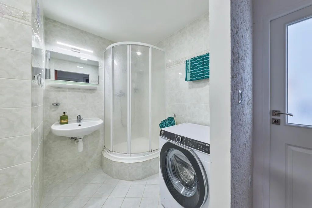 Kuchyňská linka je vyrobena na míru a doplněna kvalitními vestavěnými spotřebiči, které elegantně zapadají do celkového designu. Obývací část nabízí dostatek prostoru pro relaxaci i společenská setkání, přičemž designové osvětlení a pečlivě zvolené materiály podtrhují celkový charakter interiéru. Ložnice působí klidným a vzdušným dojmem, ideálním pro odpočinek.