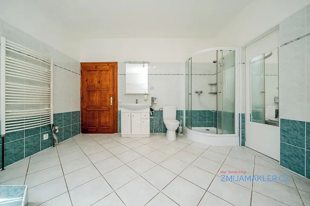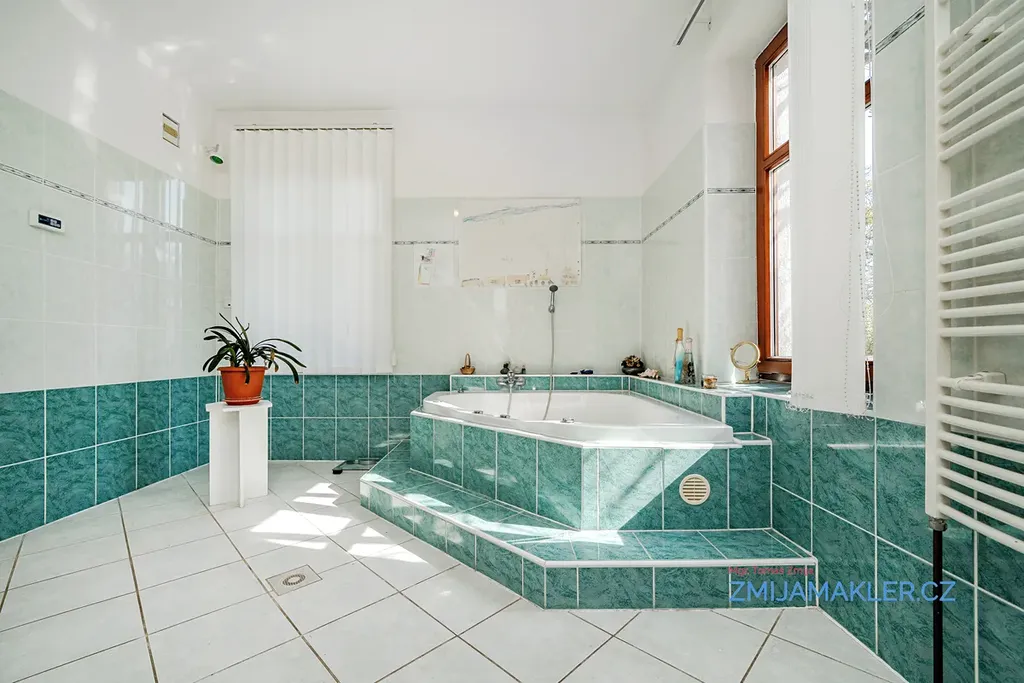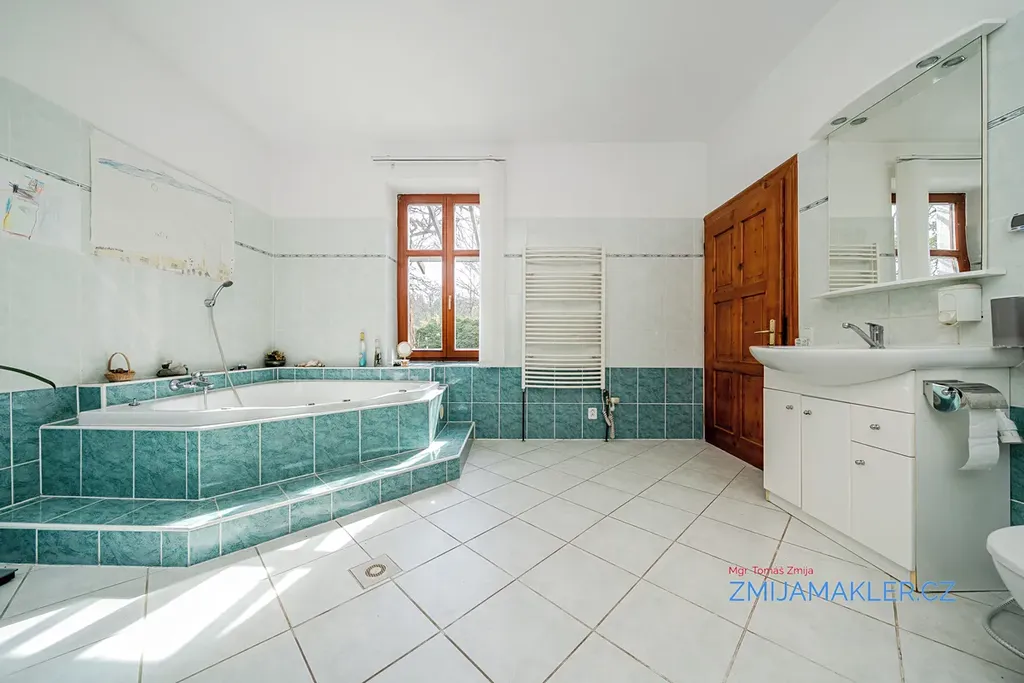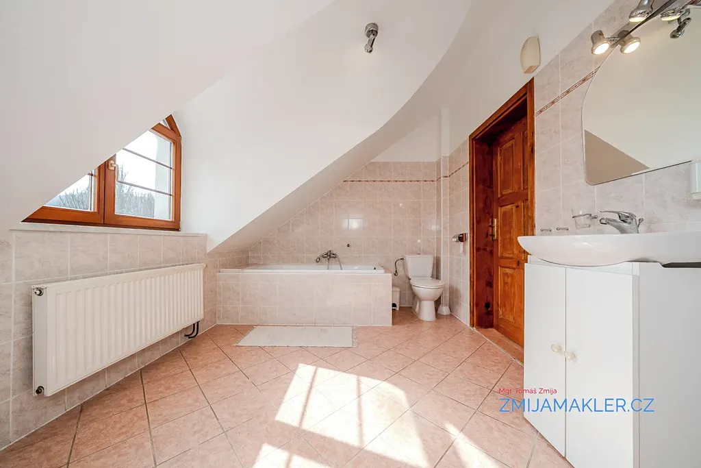 Na opačné straně chodby je kuchyně s možností zřízení jídelny a naproti koupelna s vanou a WC. Topení a ohřev vody v domě zajišťuje plynový kondenzační kotel, nové radiátory a rozvody v mědi.