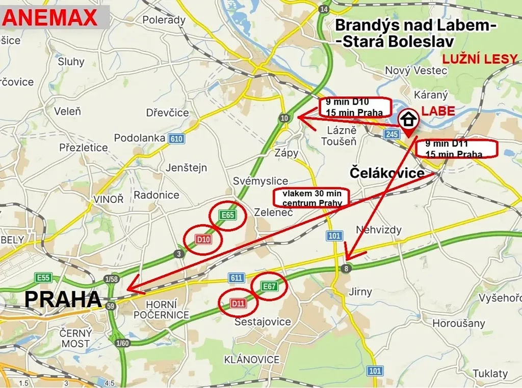 DOPRAVNÍ DOSTUPNOST do centra Prahy je výborná - každých 30 minut jezdí vlak. Z Čelákovic se také velmi rychle dostanete na dálnici D10 a D11 – Praha Černý Most cca 15 min.
