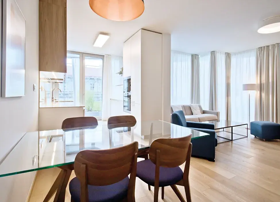Na dokončení interiérů byly pečlivě vybírané ty nejkvalitnější materiály - dřevěné podlahy, francouzská okna, bezfalcové interiérové dveře, koupelny od oblíbeného a světově známého výrobce Villeroy & Boch, celoplošné podlahové vytápění, klimatizace. Prostorná vstupní hala a vestavěné skříně nabízí dostatek úložného prostoru. K dispozici jsou 2 garážové stání v podzemních garážích a sklepní kóje. Uzavřený areál s 24 hodinovou recepcí s ostrahou Vám zajišťuje maximální soukromí, klid a bezpečí ve Vašem novém domově. Byt je plně vybaven. V zařízených apartmánech je součástí nájmu úklid 2x měsíčně, včetně výměny ložního prádla a ručníků. Dále pak údržba předzahrádky.