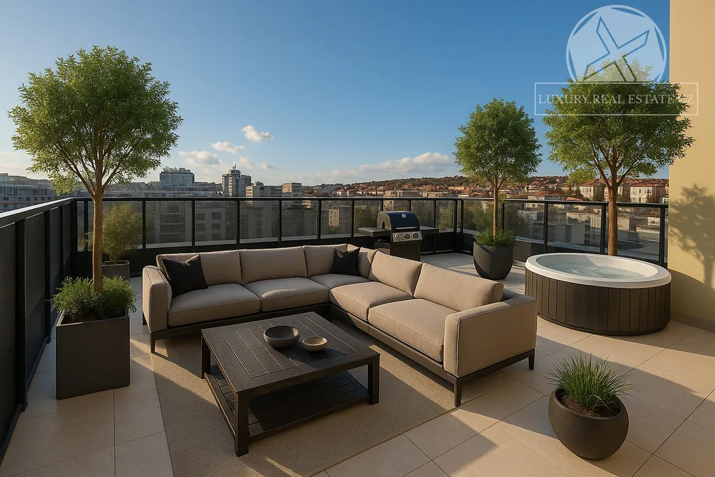 Libí se Vám tato představa? Může se stát realitou - máme zde neopakovatelnou nabídkou bytové jednotky (Penthouse) v dispozici 2+KK (56,5m²) s vlastní panoramatickou terasou (28m²) v posledním patře novostavby developerského projektu THE TRIANGLE, etapa A, který právě dokončujeme (kolaudace do 31.11.2025).